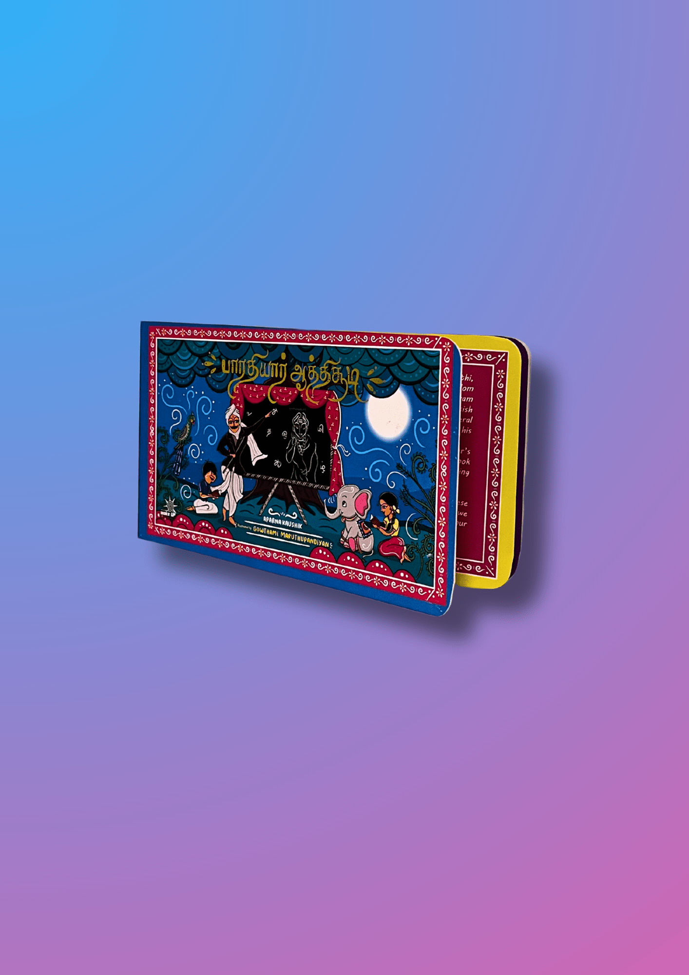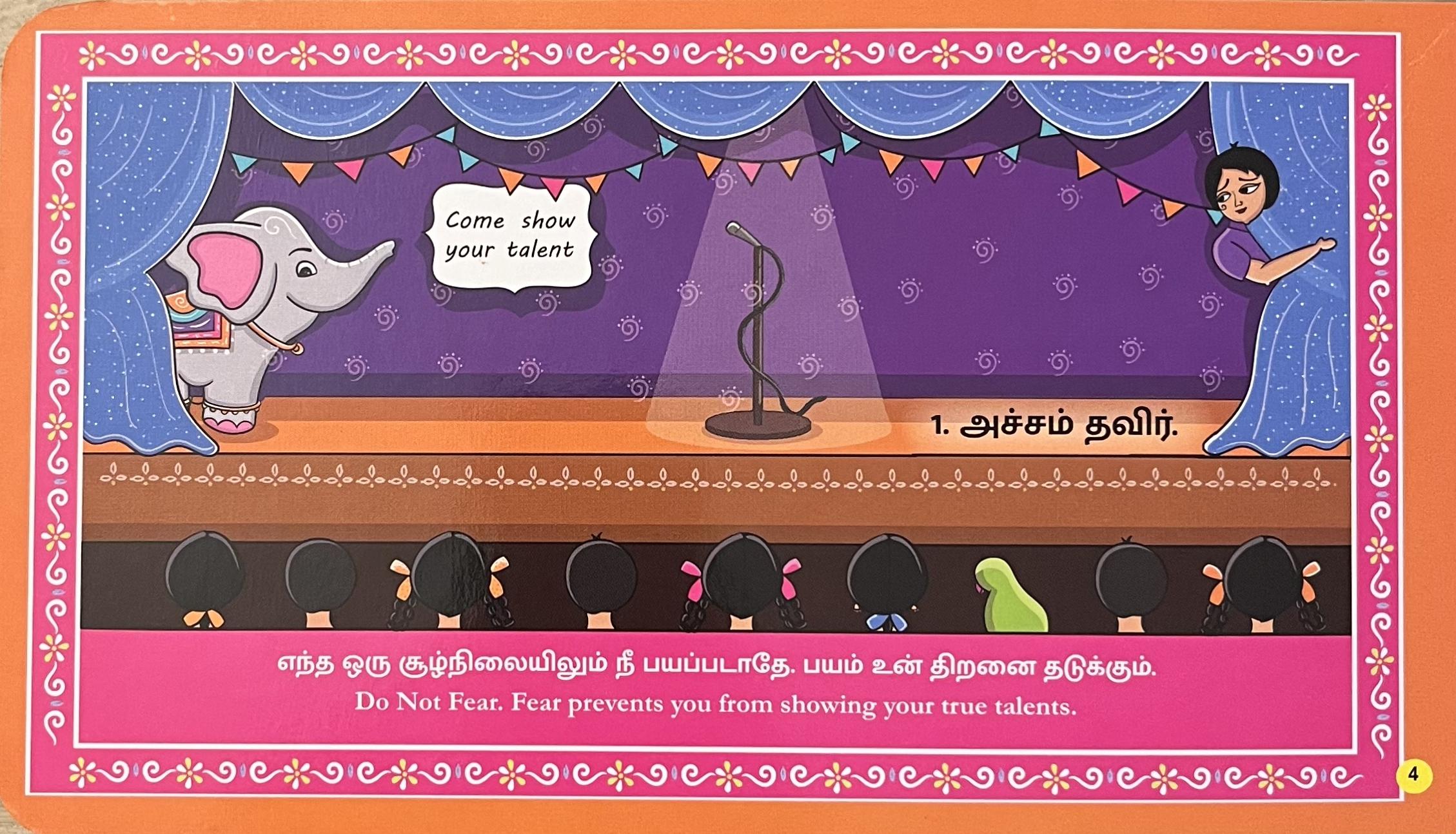 Bharathiyar Aathichudi is a children’s book that combines inspiring messages with matching illustrations to teach moral values and life lessons, encouraging courage and unity in young readers.