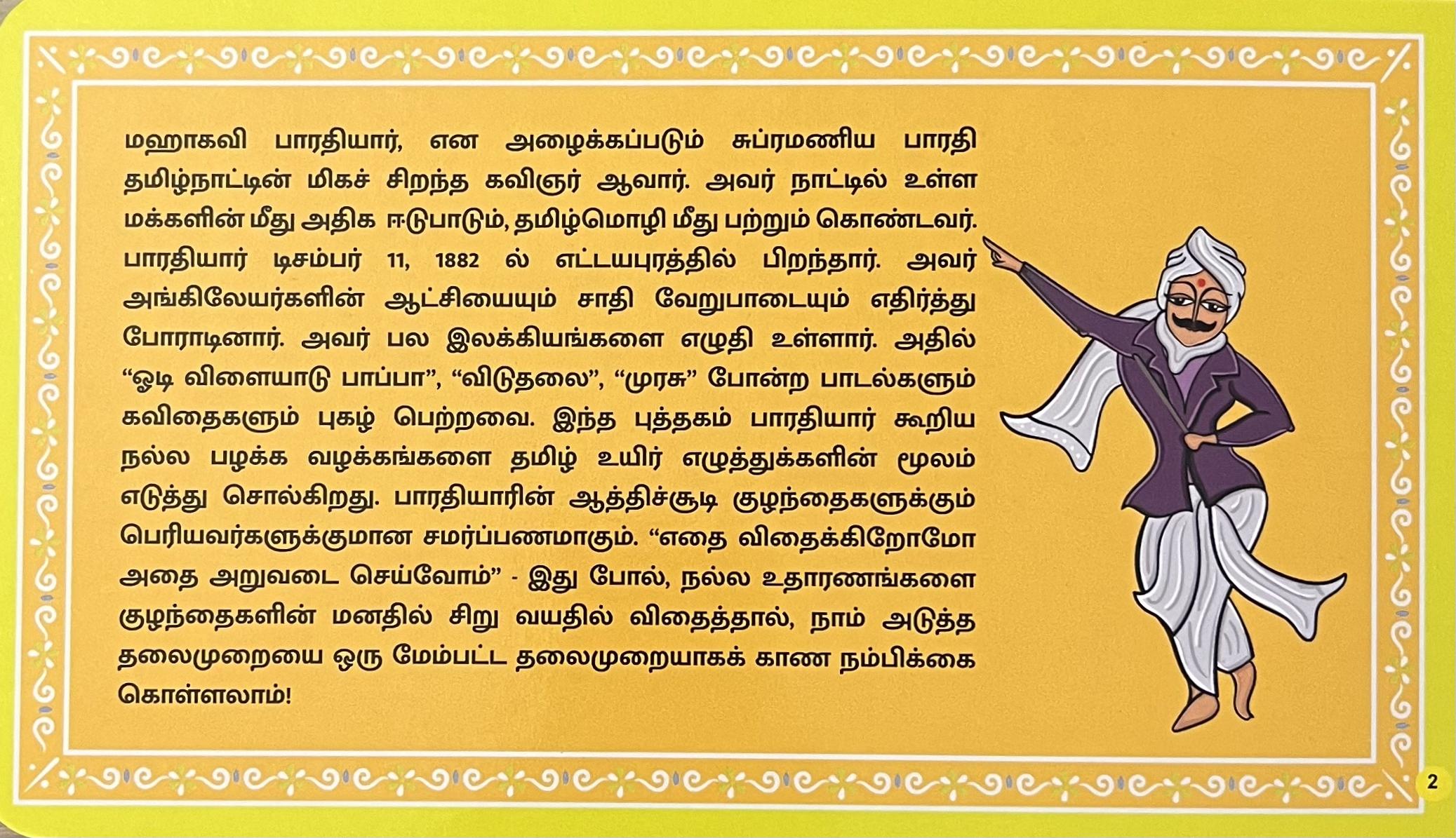 Bharathiyar Aathichudi is a children’s book that teaches important lessons about courage, unity, and doing the right thing through simple, powerful messages. Written by the great poet Mahakavi Bharathiyar, who believed in changing society for the better and empowering young people, this book is meant to inspire kids. Like Auvaiyar’s Aathichudi, it helps children learn important values they can use in their everyday lives.