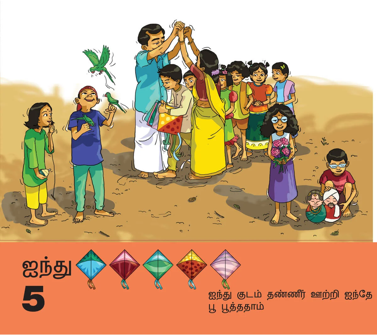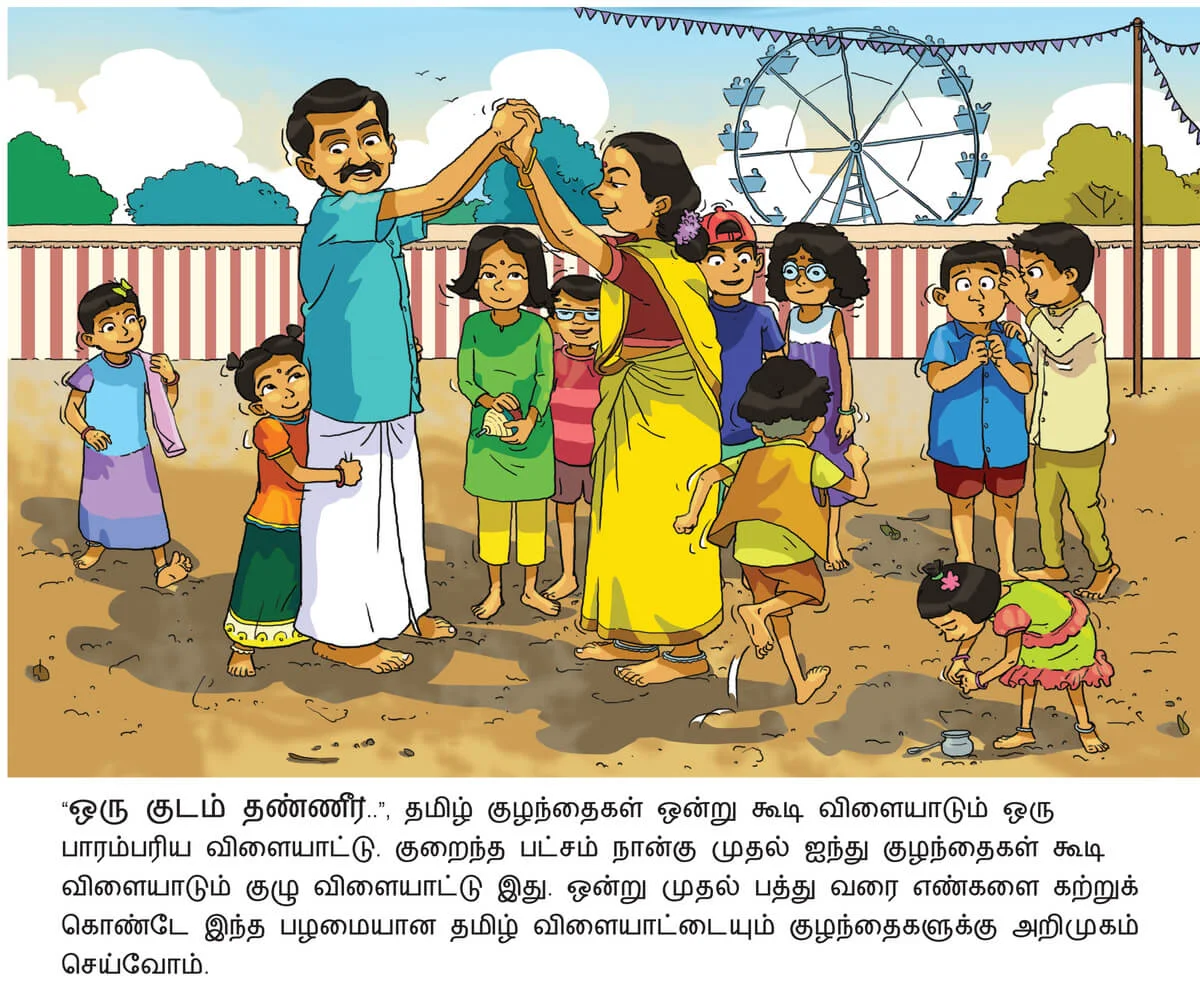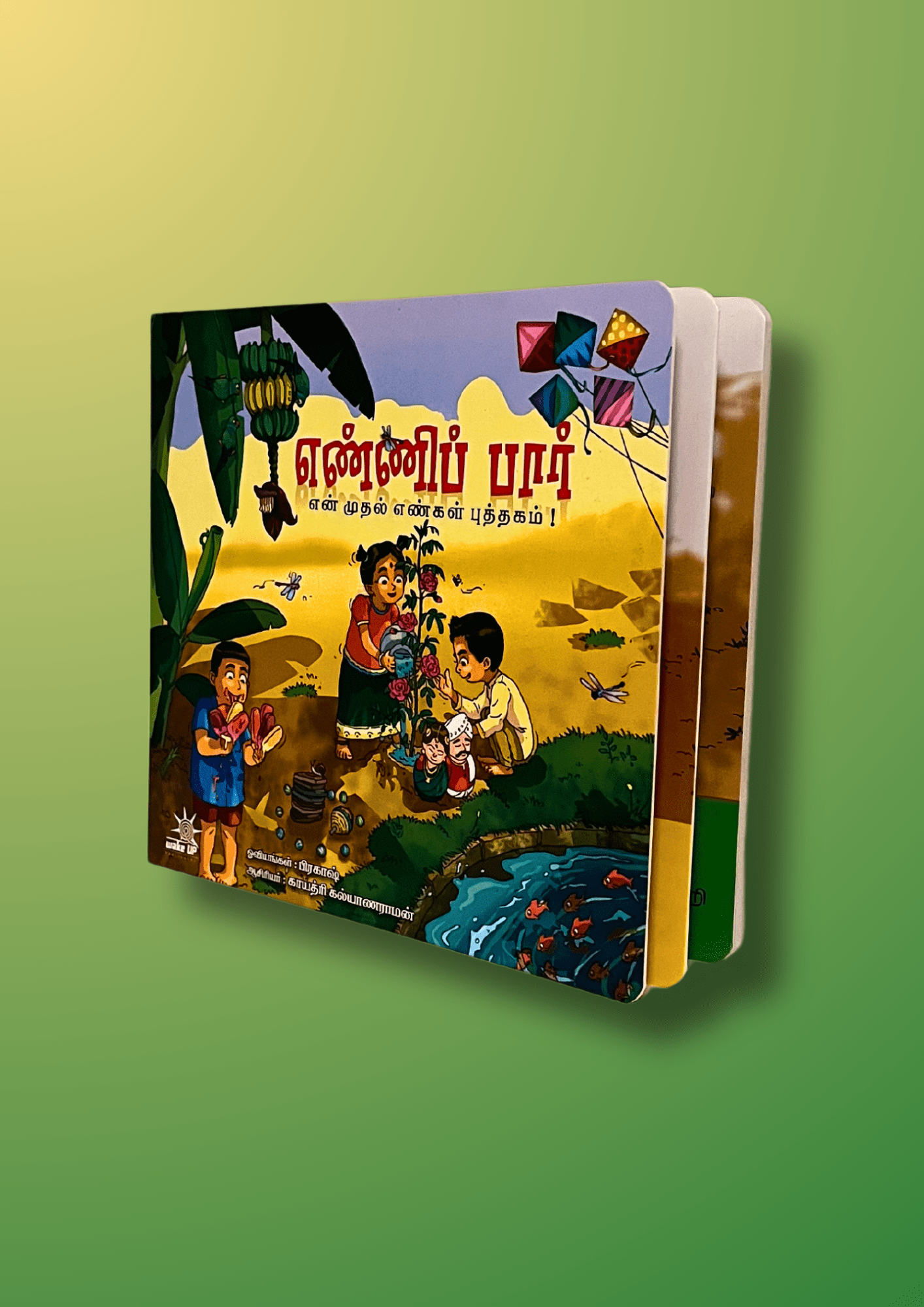 “Eanni Paar” introduces children to the traditional Tamil game “Oru Kudam Thanneer,” where kids gather and play while learning to count from one to ten. This book brings the joy of cultural games to life, combining fun with the educational experience of learning numbers.